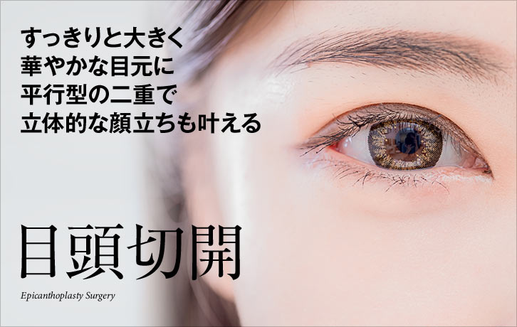 | 施術の内容 | 目頭切開は、蒙古ひだを切り取る、内眼角切開法(目頭切開)という手術です。目の横径が広がり、特に鼻側が広くなるため、より立体的な顔貌となり、目元がしまった知的な印象を与えます。200,000〜250,000円(当時の価格で現在とは異なる場合があります) |